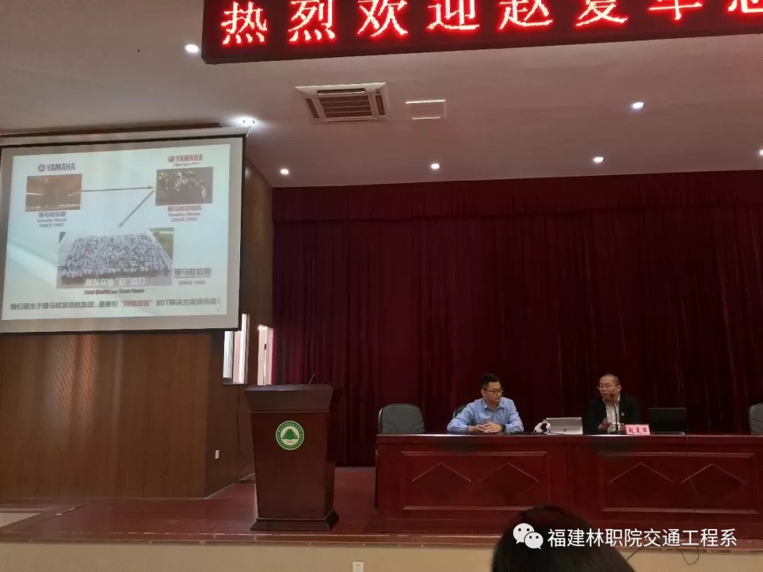 第一位开讲的是雅马哈发动机(厦门)信息系统有限公司的赵复军总经理。他首先为同学们播放了雅马哈的宣传片,介绍了雅马哈是世界五百强企业,并且在多项领域在全球领先的造诣,接下来跟同学们讲述了一些他们企业的一些主要经营项目,企业文化和对于企业来讲需要什么样的人才等等的一些与同学们息息相关的话题,最后他向我们公布了雅马哈发动机(厦门)信息系统有限公司与我校签订校企合作协议这一个好消息,全体师生都轰动起来了,因为我们学校还从来没有跟世界五百强的企业合作过。赵复军总经理的讲座完成后,台下的老师同学们也是报以热烈的掌声。