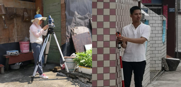 五个老师经过简单的仪器培训和测绘步骤培训,即分成两组进行测量生产实践。实践内容是利用全站仪对农村房屋及其周边15m内的地形进行坐标采集,利用cass软件进行图形绘制成果。