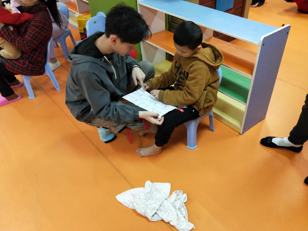 玩闹一会儿后我们就开始了今天的主题:认识几何图形。志愿者们让孩子看着图片,教他们说出图形的名字。孩子们学的不是很快,但都很用心。在志愿者的努力下,大部分孩子都可以或多或少的说出图形的名字了。