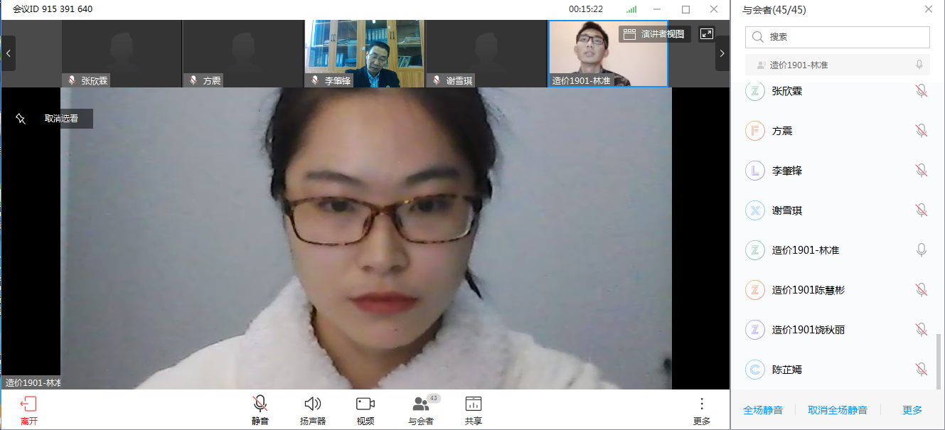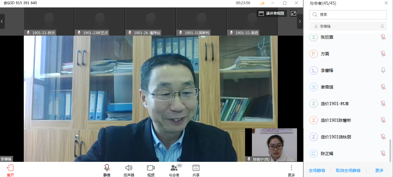 为深入贯彻落实习近平总书记关于打赢疫情防控阻击战的重要指示批示精神,积极响应福建省委教育工委、省教育厅和院党政有关疫情防控工作部署,进一步做好我院疫情防控工作,按照《福建林业职业技术学院关于疫情期间组织开展网络主题班会活动的通知》要求,2020年3月11日下午交通工程系工程造价1901班召开以“疫情就是命令、防控就是责任”为主题的线上网络班会,本次班会邀请到我系党总支书记李肇锋参加,班会由辅导员陈晓宁主持、工程造价1902班全体同学参加,李书记作重要讲话。