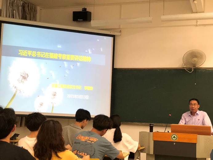 为深入学习贯彻习近平总书记来闽考察重要讲话精神,加强我系学生党史学习教育,按照学院党史学习教育统一安排,5月13日下午,我系党总支书记李肇锋为所联系的班级同学们上了一堂以“学习习近平总书记在福建考察重要讲话精神”为主题的生动党课。