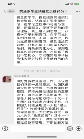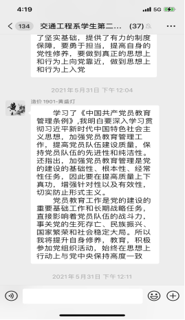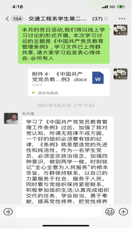 为了深入学习贯彻习近平新时代中国特色社会主义思想,加强党员教育管理工作,提高党员队伍建设质量,保持党员队伍的先进性和纯洁性,5月31日,交通工程系学生第一、第二党支部开展线上主题党日活动,讨论学习。