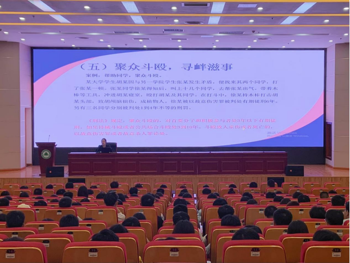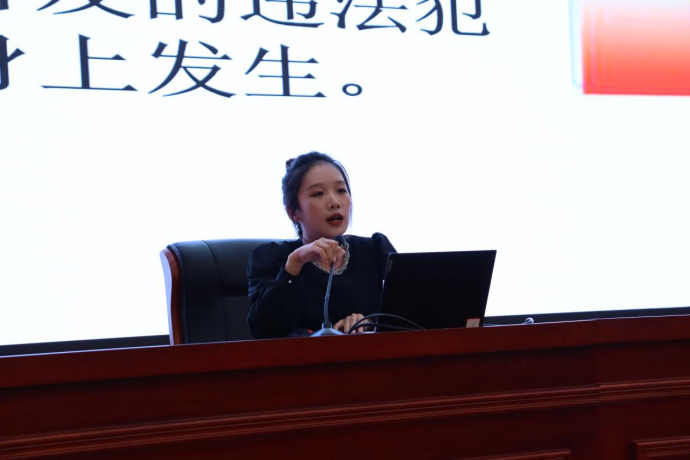 韩老师从三个切点入手,向同学们一一讲述。首先从法治教育方面开始系统的向同学们讲述大学生容易踏入的法律陷阱,容易掉落的犯罪深渊。呼吁同学们日常生活中不要忽略自身的情绪波动,要注重自身心理情绪的调节,培植健康的心理,预防遏制不健康心理引发的违法犯罪情况发生。随后从校纪校规方面系统地向同学们介绍了我校纪律处分的种类以及适用条件,希望同学们在这里能够拿起“法律之剑”,守好“道德之盾”,克己复礼、严于律己。