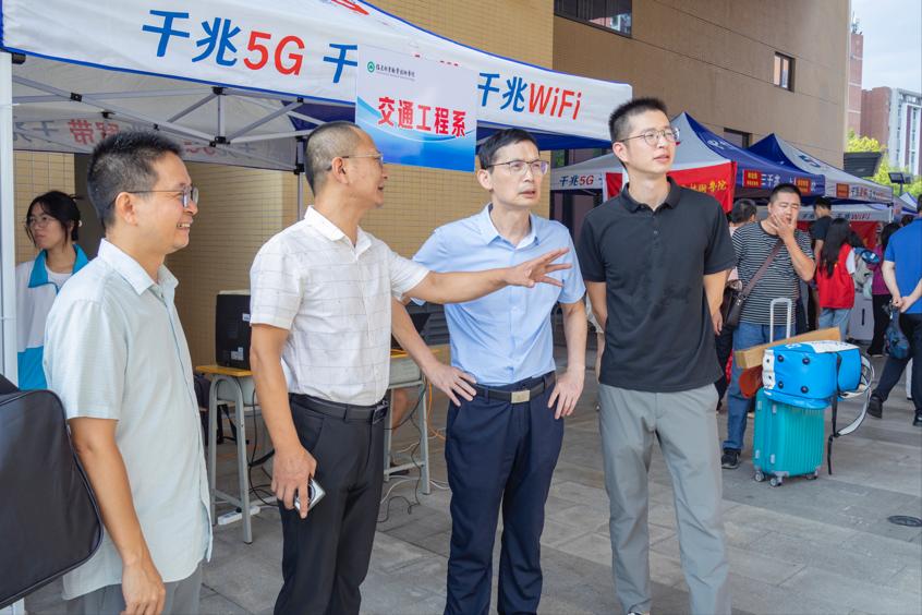 高度重视,情暖现场。9月6日,院党委书记陈建辉、院长刘文开、院党委副书记严绍裕、副院长谢金生及相关部门负责人莅临我系新生报到现场,详细了解迎新工作的进展、新生报到流程和住宿安排情况,并向迎新一线的全体人员表示感谢,对志愿者饱满的精神状态和热情周到的服务表示充分肯定,嘱咐他们耐心、细心地做好迎新服务工作,给新生和家长舒适、美好的体验。