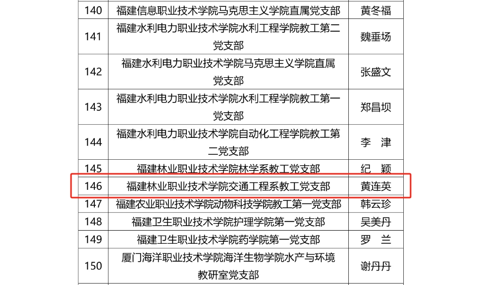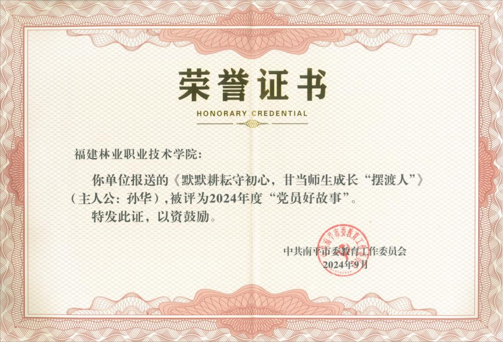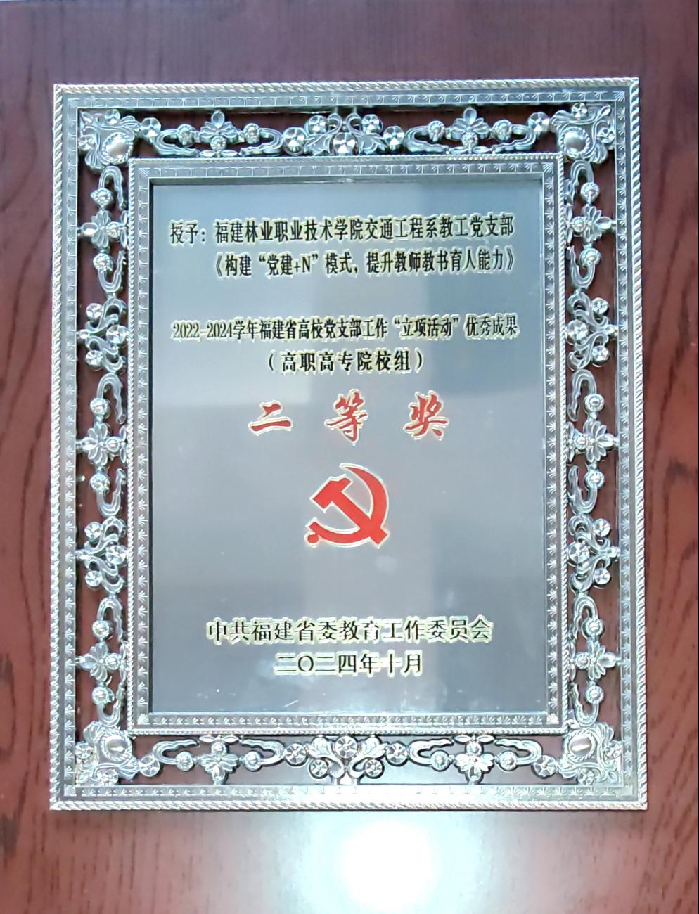 教工党支部入选全省高校“双带头人”教师党支部书记“强国行”专项行动团队名单。教工党支部选送的“立项活动”项目在全省高校党支部工作“立项活动”优秀成果评选中荣获二等奖;学生第二党支部选送的作品荣获中共南平市教工委2024年“书记好党课”表彰;教工党支部选送的作品荣获中共南平市教工委2024年“党员好故事”表彰。