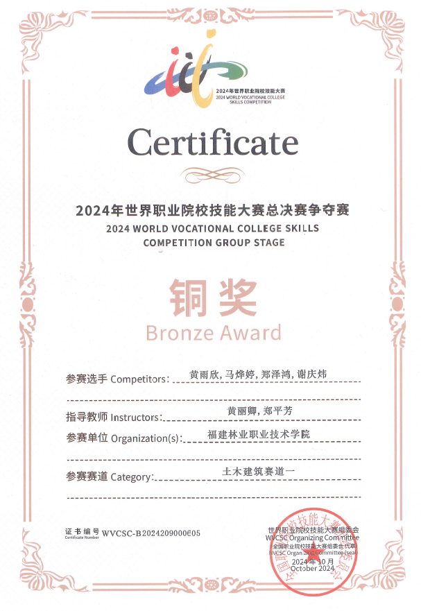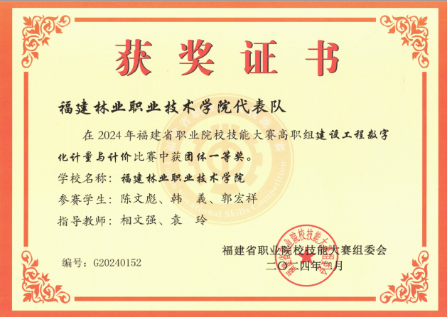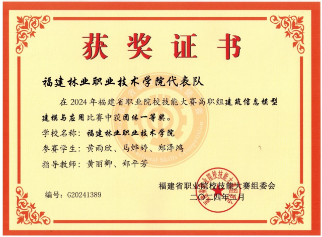 高水平专业建设稳步推进,“三全育人”“五育并举”运行机制不断优化,体育、美育、劳动教育更富特色,及时把新方法、新技术、新工艺融入到专业教学过程中,优化专业(群)课程结构体系。组建两个团队参加福建省教师教学能力大赛分别获二等奖1项和三等奖1项,建设省级职业教育在线精品课程2门。在2024年福建省第一届职业技能大赛“建筑信息模型技术”赛项中黄丽卿老师获全省第5的好成绩。