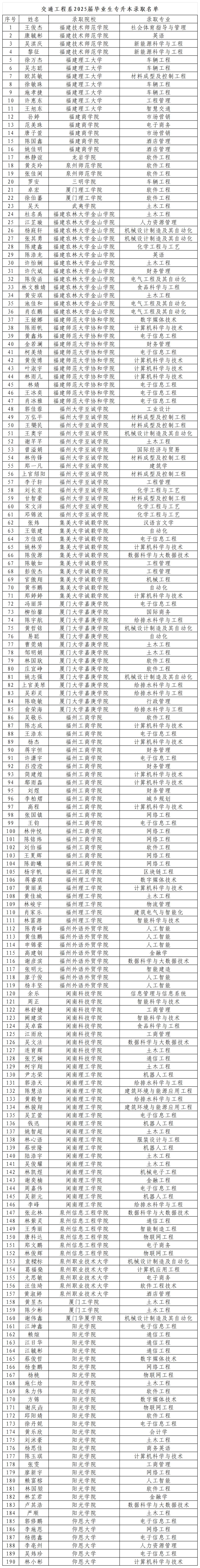 春风得意马蹄疾,一日看尽长安花。在2025 年福建省专升本考试录取结果陆续揭晓之际,交通工程系迎来喜讯!我系 2025 届毕业生在专升本考试中脱颖而出,成绩斐然,交出了一份令人瞩目的答卷。我系共345名学生报考,190名学生被本科院校录取,录取率达55%,其中23名学生被公办院校录取。