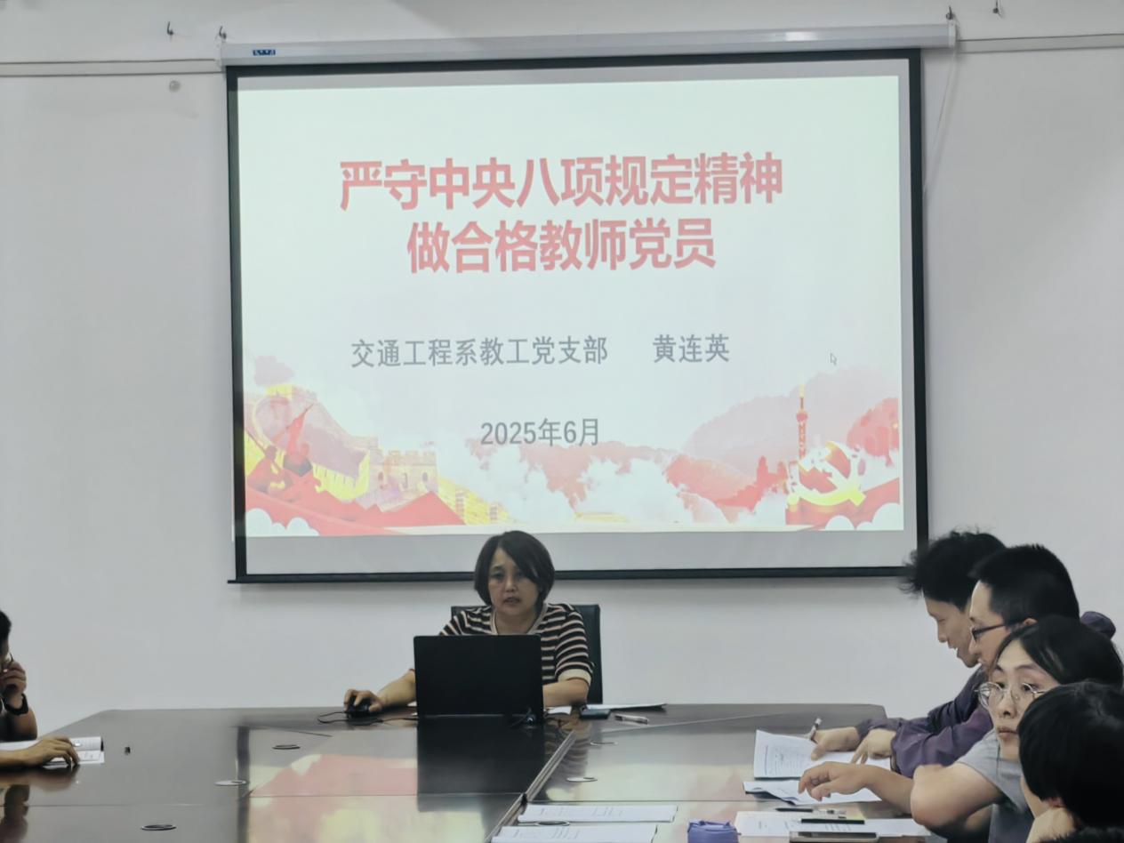 为进一步强化教师党员的纪律作风建设,引导广大教师党员深刻领会中央八项规定精神的内涵要求,2025年6月26日,交通工程系教工党支部组织开展了“严守中央八项规定精神,做合格教师党员”专题党课。党课由交通工程系教工党支部书记黄连英主讲,支部全体党员参加学习。