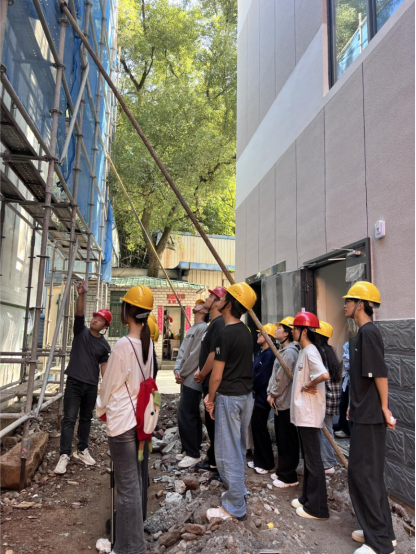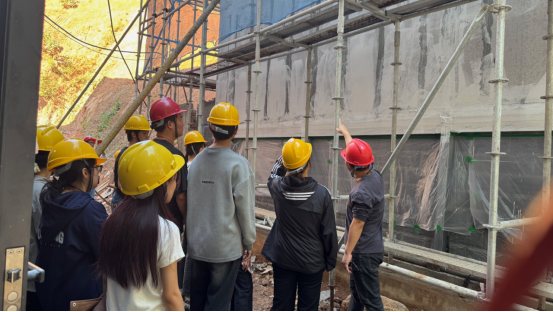 活动伊始,安全是必不可少的“第一课”。在项目人员的指导下,同学们认真聆听了施工安全知识讲解,随后领取并规范佩戴了安全帽等防护装备,这个小小的仪式感,瞬间将大家带入了严谨的工地氛围。