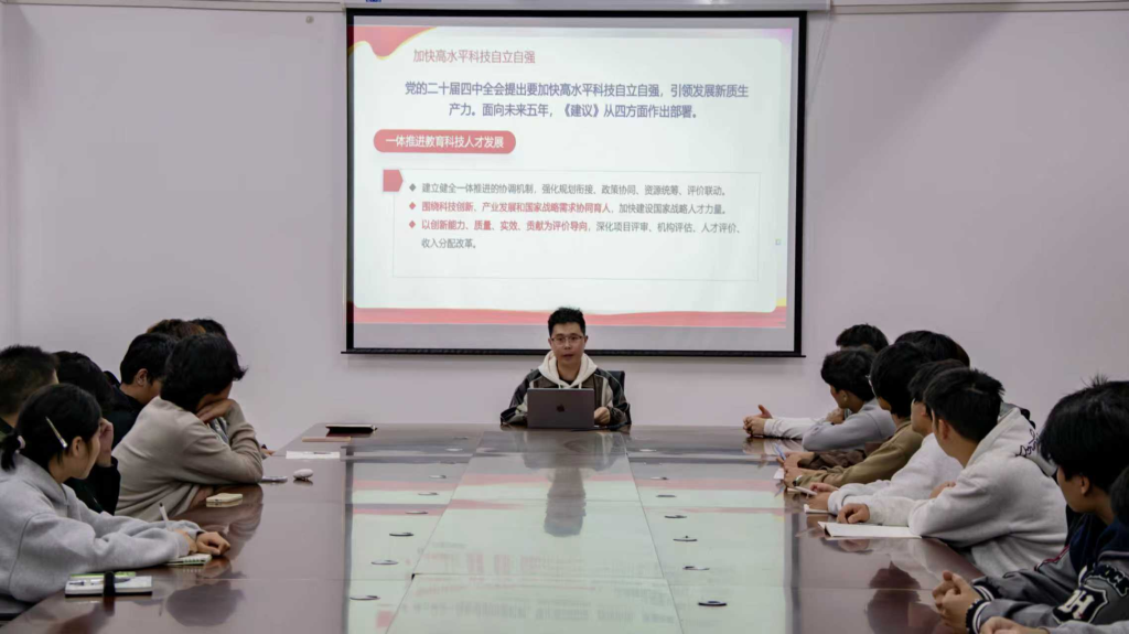 课上,支部书记高旭从《中共中央关于制定国民经济和社会发展第十五个五年规划的建议》(简称《建议》)的三大板块入手,首先阐述了“十五五”时期的指导方针与发展环境的总体判断,随后带领大家逐一学习了《建议》部署的各项战略任务和重大举措,涵盖了加快农业农村现代化、建设现代化产业体系、建设强大国内市场、促进区域协调发展、加快高水平科技自立自强、扩大高水平对外开放、卫生健康和人口发展,并最后落脚到坚持和加强党的全面领导这一根本保障。