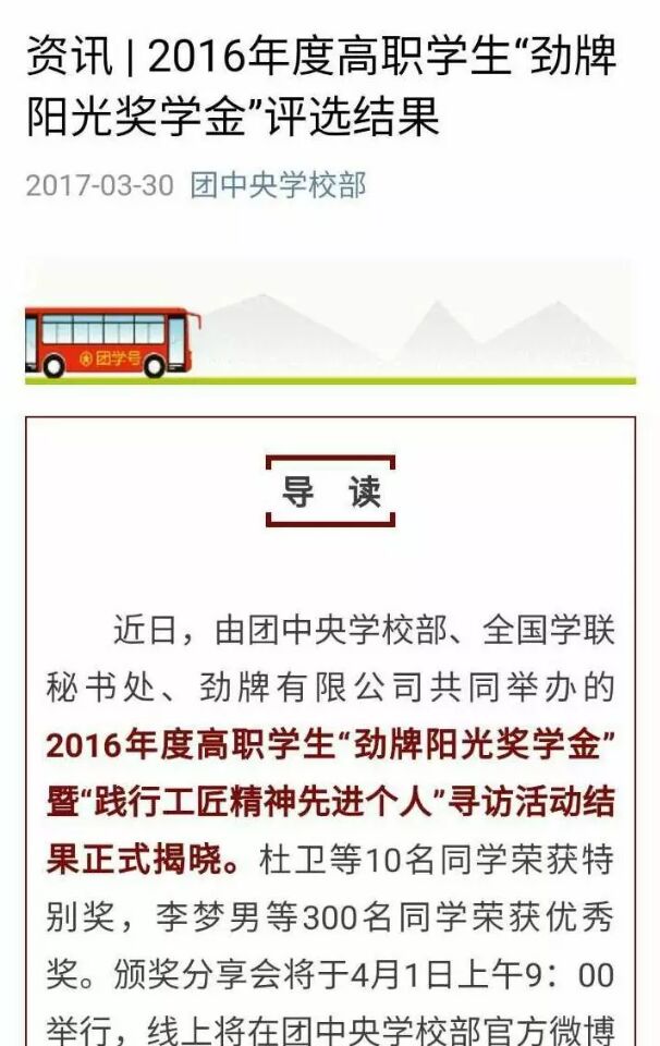 近日,从团中央学校部微信公众平台获悉,由团中央学校部、全国学联秘书处、劲牌有限公司共同举办的2016年度高职学生“劲牌阳光奖学金” 暨“践行工匠精神先进个人”寻访活动结果正式揭晓。我系陈永华等300名同学荣获优秀奖,被授予2016年度高职学生“劲牌阳光奖学金” 暨“践行工匠精神先进个人”荣誉称号。另外,此次颁奖分享会将于4月1日上午9:00举行,线上将在团中央学校部官方微博平台直播。