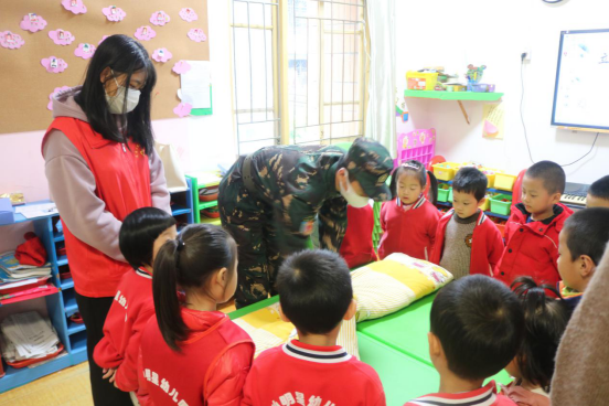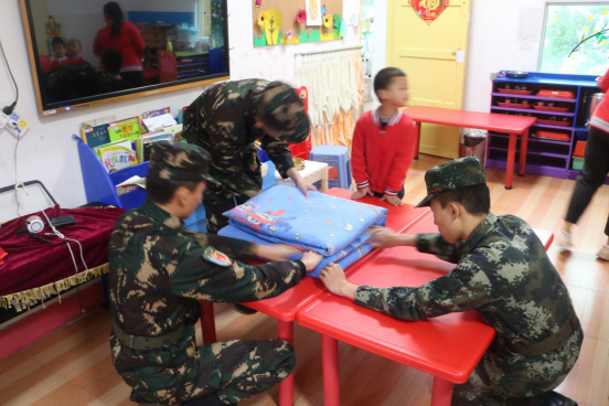 “你好,解放军叔叔!”我系学生支部的退伍军人们身着迷彩服,伴随着孩子们清脆有力的声音进入了各个班级。一堂别开生面的“军旅生活”在小明星幼儿园拉开帷幕。支部的同学们用生动形象的语言与小朋友们讲述了军旅生活的故事,讲述完后便和小朋友们互动起来。和小朋友们相互拉歌,玩游戏。最后教小朋友们叠起了被子,志愿者们为小朋友们展示了标准的叠“军被”的方法一床床豆腐块,映入了小朋友们的眼帘,小朋友们跃跃欲试的都要来体验叠“军被”。