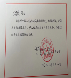 身着军装,手握钢枪是他一直以来的梦想追求,今年他如愿以偿。2023年3月17日,他顺利完成了役前训练,告别长辈至亲去到了新兵连。这一天,他坚定地对新兵连的班长说:“我或许不能在其他事业领域有所成就,但因我是一名共产党员,从我毅然选择入伍的那一天起,我便下定决心用自己的青春守护祖国的荣光,为国防事业贡献出自己的绵薄之力。”
