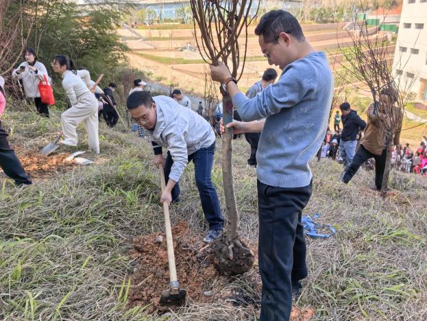 活动中大家热情高涨,三两成组,互相帮助,默契配合,扶苗、培土、踩实、围堰、浇水各个环节衔接有序,现场满是忙碌的身影和劳动的欢声笑语。经过1个多小时的忙碌种植,一颗颗树苗稳当地在土地里“安家落户”,为校园增添了一抹清新绿意。