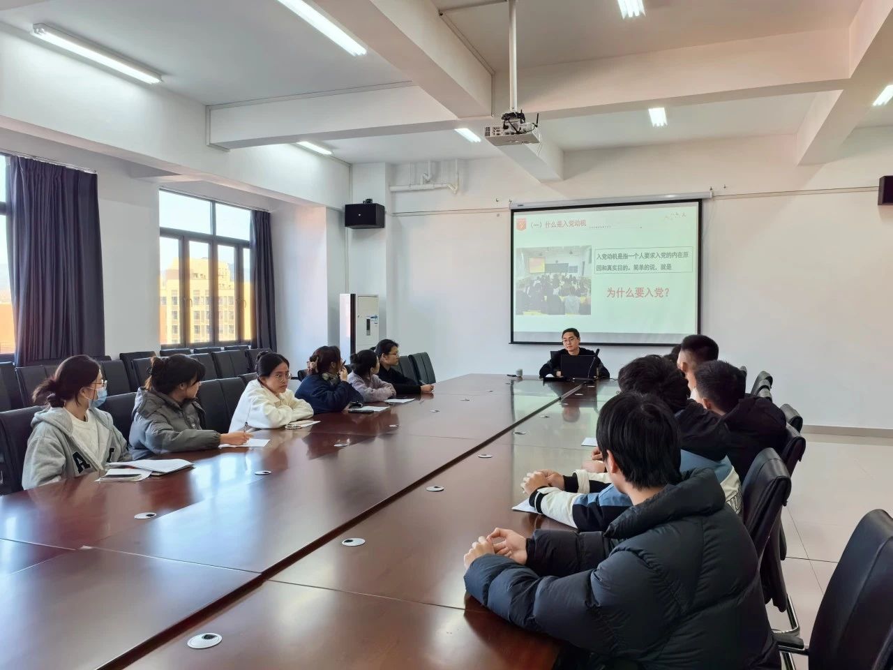 苏老师从什么是正确的入党动机、为什么要端正入党动机、按照党员标准严格要求自己三个部分进行介绍。强调入党动机正确与否,关系到党的纯洁性和党组织的战斗力。对于党来说,如果党员的奋斗目标不正确,就意味着他要谋取其他的目标,从而损害党的纯洁性,影响党的形象,破坏党的战斗力。对于个人来说,如果入党的目的不正确,意志不坚定,即使入了党,也难免会在严峻的考验面前迷失方向,甚至走上错误的道路,不仅给党的事业带来损失,而且毁了自己。他要求同学们要端正入党动机,要有为共产主义和中国特色社会主义奋斗终身的坚定信念,要有全心全意为人民服务的思想,要有在工作、学习和生活中起先锋模范作用的觉悟。