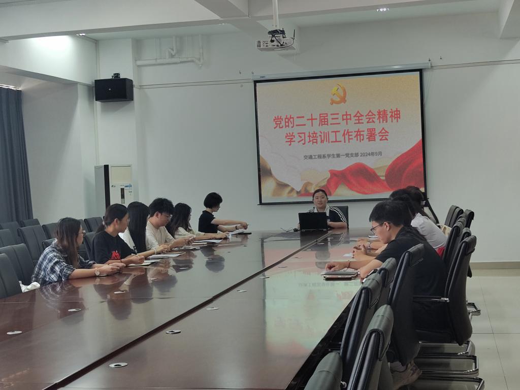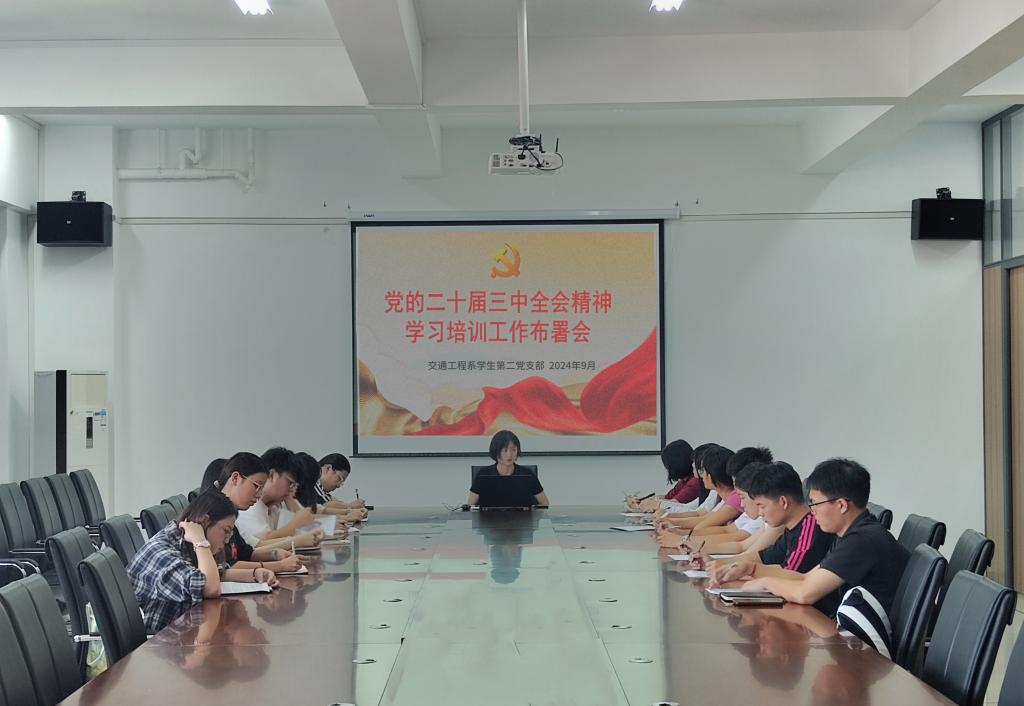 为了深入学习贯彻党的二十届三中全会精神,贯彻落实学院党委关于学习党的二十届三中全会精神学习培训工作的实施方案,进一步提升学生党员的政治素养和理论水平,确保全会精神在学生党员中得到广泛传播和深入学习,2024年9月20日,交通工程系学生第一、第二党支部依次在交通楼501会议室组织全体师生党员开展党的二十届三中全会精神学习培训工作布署会。