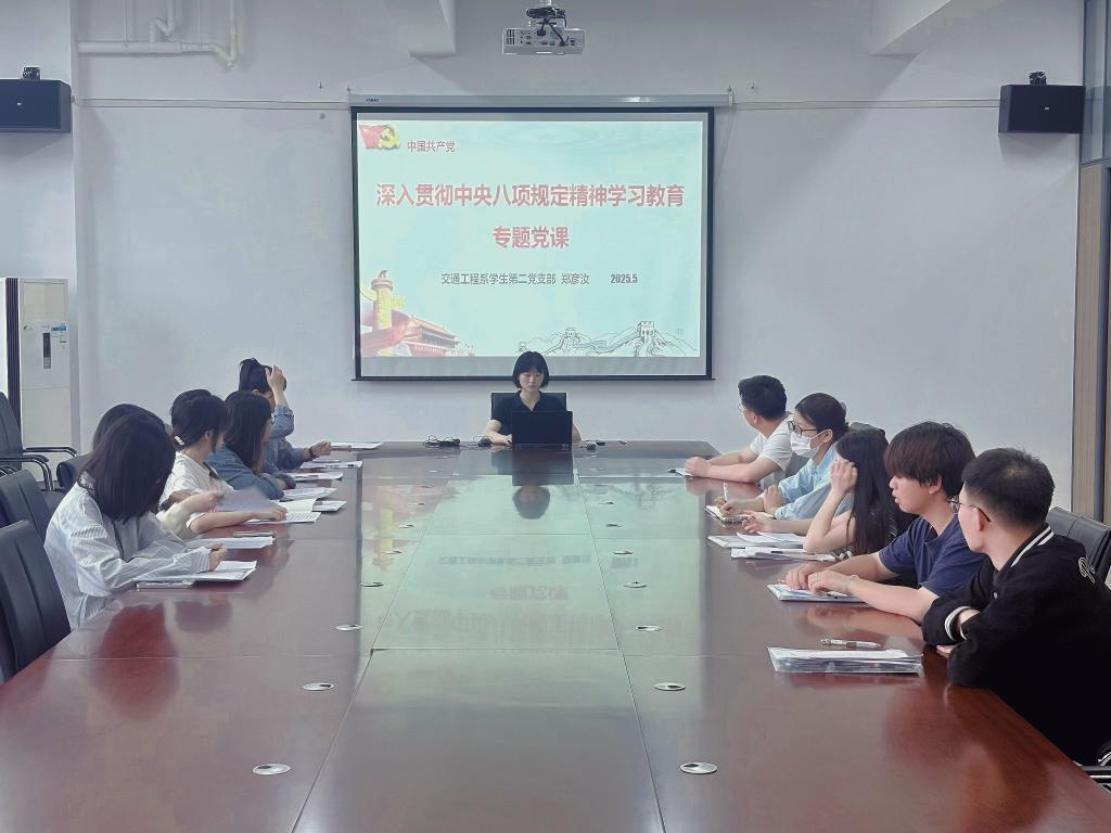 为深入贯彻落实中央八项规定精神,加强青年学生党员的纪律规矩意识,交通工程系学生第二党支部书记郑彦汝于5月28日在交通楼501会议室组织开展深入贯彻中央八项规定精神学习教育专题党课。本次党课旨在推动纪律教育从“理论灌输”向“行为自觉”转化,引导青年学生党员深刻领悟中央八项规定精神的核心要义,并将其内化为自身的行为准则,为党的作风建设注入新的活力。