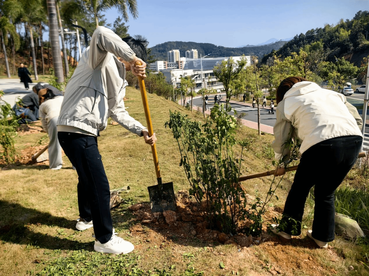 “坑再挖深一点,土要踩实些……”经验丰富的老教师一边劳动,一边不忘指导年轻教师,现场不时传来阵阵欢声笑语。尽管大家的鞋子和裤腿沾满了泥土,额头上渗出了汗珠,但看着眼前一株株新栽下的树苗昂然挺立,在春风中展现出勃勃生机,每个人的脸上都洋溢着劳动带来的喜悦和自豪。