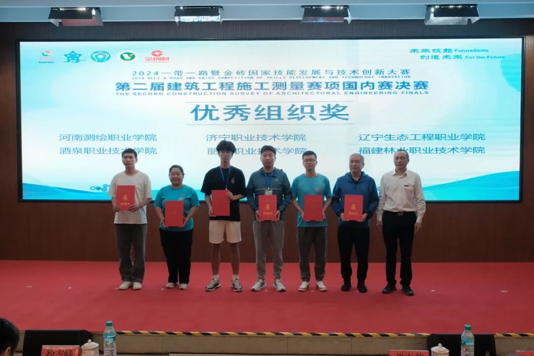 9月19日至23日,2024一带一路暨金砖国家技能发展与技术创新大赛“建筑工程施工测量”赛项国内赛决赛,在江西应用技术职业学院黄金校区举行,来自25个省市65所高职院校的120支参赛队伍报名参加比赛。我系由黎文娥、赖晓龙等老师组成的指导教师团队,由翁晨辉(测绘地理信息技术2201班)、肖楷宸(测绘地理信息技术2203班)两位同学组成的参赛队参加了比赛,经过激烈的技能竞技,取得了赛项的二等奖的好成绩,学院获得优秀组织奖。