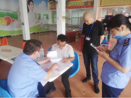 本网讯 为切实做好2020年春季学期学生返校复学保障工作,进一步做好食品安全管理,增强食堂、超市等商户的安全责任意识,确保复学期间食品安全,2020年5月19日,学院联合夏道镇市场监督管理所对学院食堂、超市等商户进行复学前实地检查。夏道镇市场监督管理所工作人员,学院纪委书记林建斌,副院长谢金生,后勤管理处处长雷泽兴及纪检监察室、后勤管理处相关工作人员参加了检查工作。