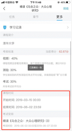 点击章节右边的更多,是一些资料、答疑、以及平常做章节测验出现的错题集、学习记录,错题集可以帮助你掌握一些易错的习题。下面还有课程简介,以及考核标准与你的当前分数,还有课程的开始时间与结束时间,还有期末考试的时间,关于课程的结束开始时间以及考试时间,同学们要格外注意,不要错过了学习的时间与考试的时间,考核的标准同学们也要注意,要注意最后的成绩由哪些方面组成。