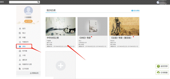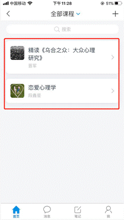 登录之后,会看到下方有四个导航栏“首页、消息、笔记、我”,在首页点击“我的课程”,就会看到你所学习的选修课。