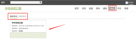 在课程空间内,点击导航栏的考试,进入考试界面,我的考试显示的是已完成的考试和未进行的考试,有效的考试时间由老师设置,这里显示的是未开始,说明开始还没开始开始,而考试时间也有预告,是6月22日至27日,在规定的时间里登录进行考试,都是可以的。如下图所示。