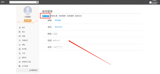 基本资料设置,同学们通过本页设置可以实现绑定邮箱、绑定手机号、修改姓名、以及学号的功能。