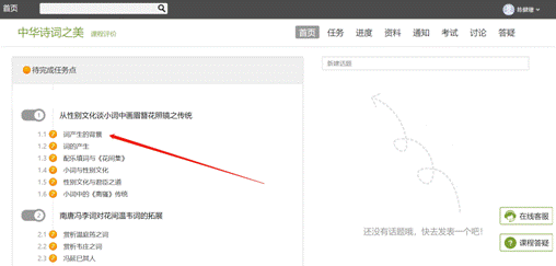 以中华诗词之美为例,点击章节知识点名称,即可进行课程学习,可以按照自己的学习进度进行课程的学习。