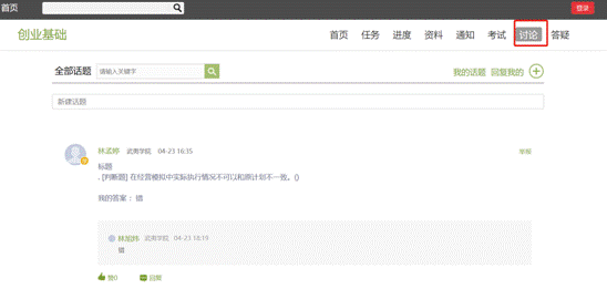 在课程空间的导航栏中点击讨论,即可进入讨论界面,学生可以在任何章节新建讨论话题,也可以在已有话题中点击回复参与讨论,老师可以对学生谈论内容加精处理,加精后的讨论显示为精华,以便学生筛选查看。除此之外,还有我的话题和回复我的两个筛选条件。讨论也是综合成绩的一部分,会占有一定的比例,同学们要时长发布讨论,才能得到相应的讨论分数。