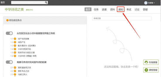 在学习页面的右侧点击通知,即可查看老师发布的通知,包括学习预警,考试信息,都可以在这里查看。