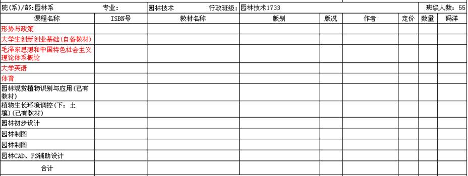一、“福建林业职业技术学院教材征订表”表中除体现本系教师任课的教材征订情况外,请将该班级的其余课程,即非本系教师征订的情况(如两课教材、英语、数学、语文等公共课程),一并体现于教材征订表中,以防漏订,教材征订时将联办校转轨新生班级名称及学生数量一并录入至青果教务系统。