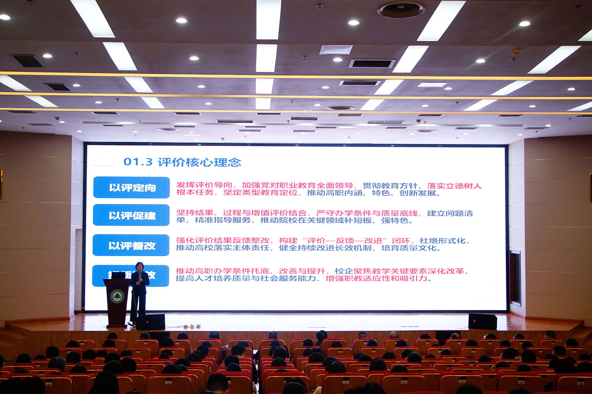 专题培训环节,黄云玲教授作《对标迎评促建 提升办学能力——高职办学能力评价文件解读》专项培训。她系统梳理国家职业教育评价发展脉络,深入解读本轮办学能力评价的新导向、新特点与新标准,重点围绕教学工作评估关键要素的六个一级指标,对评价体系进行全面、细致解读,逐条明晰各观测点标准、佐证材料归集规范及评估访谈工作要点,明确要求各部门、各院系提高站位、严格对标,精准落实各项评价任务,确保迎评工作有序推进。