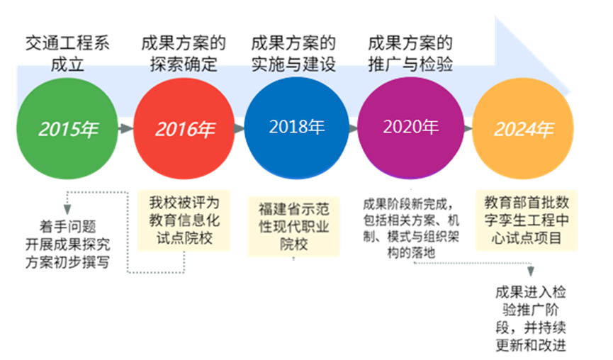 2016年——2018年:2015年我校交通工程系成立,2016年我校被评为教育信息化试点院校,2018年建成福建省示范性现代职业院校,系部相关人员开始关注人才培养适应相关产业数字化升级中的瓶颈,同年开展成果的探究和方案的初步撰写工作。