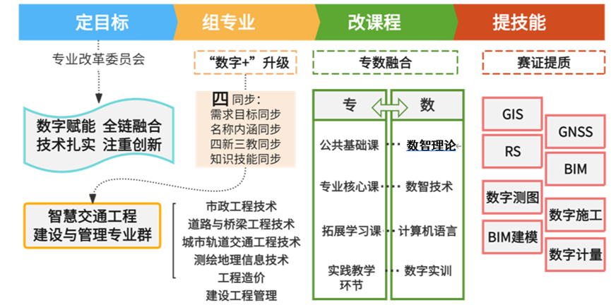 ①专数融合。以“定目标→组专业→改课程→提技能”为建设路径,推动专业群数字化转型升级。锚定“数智赋能、全链融合、技术扎实、注重创新”的主线目标,四同步“数字+”升级智慧交通工程建设与管理专业群,搭建数字模块化课程包增值课堂场景,汲取专业前沿科技和赛证创新项目,提质数字专岗技能学习。