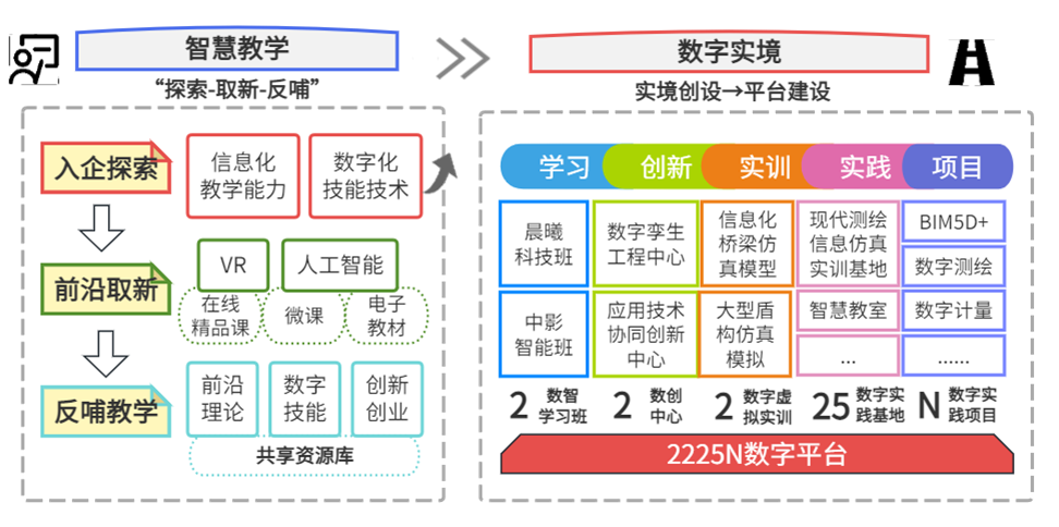 (2)创设数字实境。校企共同营造数智工匠成长生态,联合行业标杆企业,企对校提供技术、仪器与平台支持,校对企提供人才资源和智力支撑,校企互益,合作双赢。设立“学习、创新、实训、实践、项目”五个数字学习实境,架构“2225N”数字育训平台。建设国家级“数字孪生实践实训中心”和省级协同创新中心2个创新数字中心,实现数字落实、数实共生。与福建晨曦信息科技集团等优质企业深度融合,建成“晨曦工坊”,开设“晨曦科技班”和“中影智能班”2个“校工坊”制学习班,接触企业第一线,引入最新技术。建成25个实验与实训室基地,校企协同,努力为社会研发更多的适用性技术,培养智慧建造人才。校企合作共建稳定的顶岗实习基地,学生顶岗实习和预就业,学生自主选选择完成BIM5D+、数字测绘、数字计量等N个项目和技能模块,形成“2225N”数字育训平台,零距离接触产业转型创新一线技能。