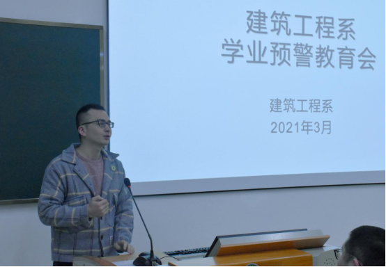 本网讯 为进一步加强建筑工程系学风建设,强化对学生学业管理,做好学生学业预警工作,积极引导学生端正学习态度,2021年3月22日20点20分,建筑工程系组织学业预警学生在实训四307教室召开学业预警教育暨学风建设教育大会,建筑工程系党总支书记王云彪、学生科科长兼团总支书记陆晓莉、辅导员吴文杰、林燕琼、陈晴等出席此次会议,本次会议由王云彪书记主持。