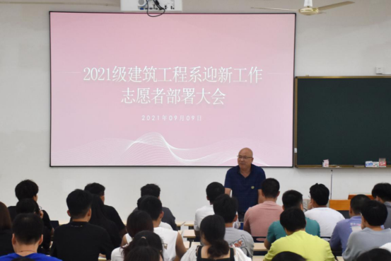 本网讯 为落实学校关于2021年迎新工作有关部署及疫情防控工作,全力保障迎新工作的顺利开展,2021年9月9日中午12:00,建筑工程系在实训四210召开“2021年迎新志愿服务岗前培训暨迎新工作部署大会”。建筑工程系党总支书记王云彪、系学生科科长兼团总支书记陆晓莉、辅导员吴文杰、全体迎新志愿者参与本次会议。此次会议由王云彪书记主讲。