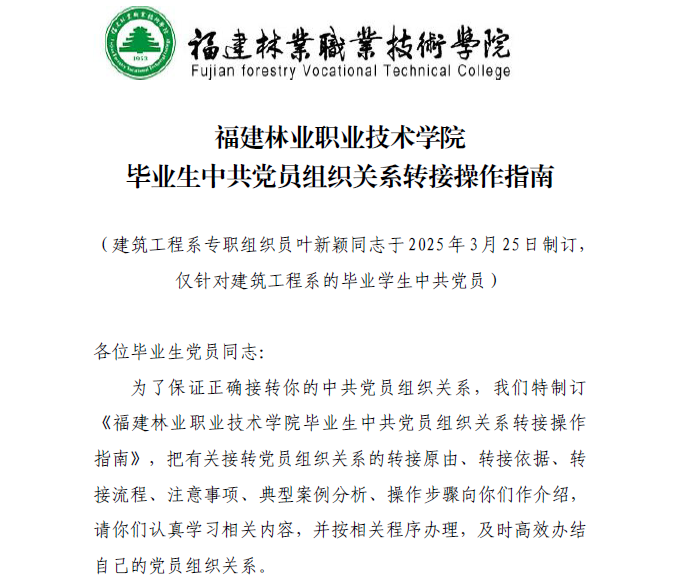 他表示,长期以来,我们系在此项工作取得成绩还是不错的,为此,我还专门出台《福建林业职业技术学院毕业生中共党员组织关系转接操作指南(建筑工程系)》。值此2025年毕业生党员即将返校之际,开展有针对性的培训,既可以提高业务能力,还可以有效助力学生党员党组织关系转接,是一件非常有实用意义的技术培训。