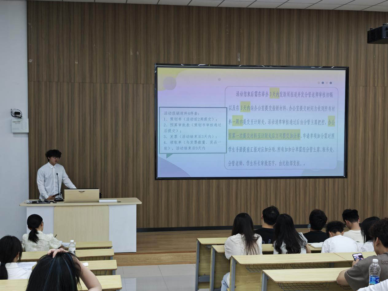 纪检部部长涂晋昌则聚焦“提交管理”,对提交时间节点、流转程序进行深度讲解。他结合《学生综合考评实施办法》,明确“日常扣分单需在事件发生后24小时内提交,集体活动加分单应于活动结束后3个工作日内汇总”的刚性要求,并绘制流程图直观展示“填写-部门初审-秘书处复核-辅导员终审”的完整闭环。针对“跨部门协作单据提交冲突”“特殊情况延期申请”等难点,他通过情景模拟现场演示应对策略,叮嘱学员:“严守时间红线是制度权威性的体现,也是对每位同学权益的负责。”