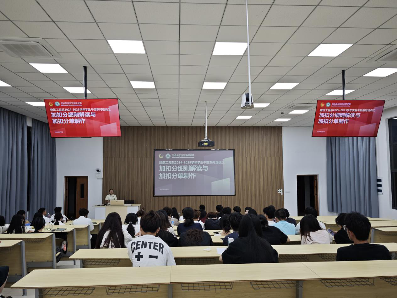 本网讯/为进一步提升学生干部日常管理效能,强化学生干部队伍建设,提升日常管理工作效能,保障加扣分制度规范、严谨执行,2025年6月5日,建筑工程系于阶梯教室二举办学生干部系列培训第六专题——"加扣分细则解读与加扣分单制作"专题培训。本次培训由系学生会秘书处主任刘艳、纪检部部长涂晋昌联合主讲,通过“理论+实操”双轨模式,系统讲解加扣分管理全流程要点。
