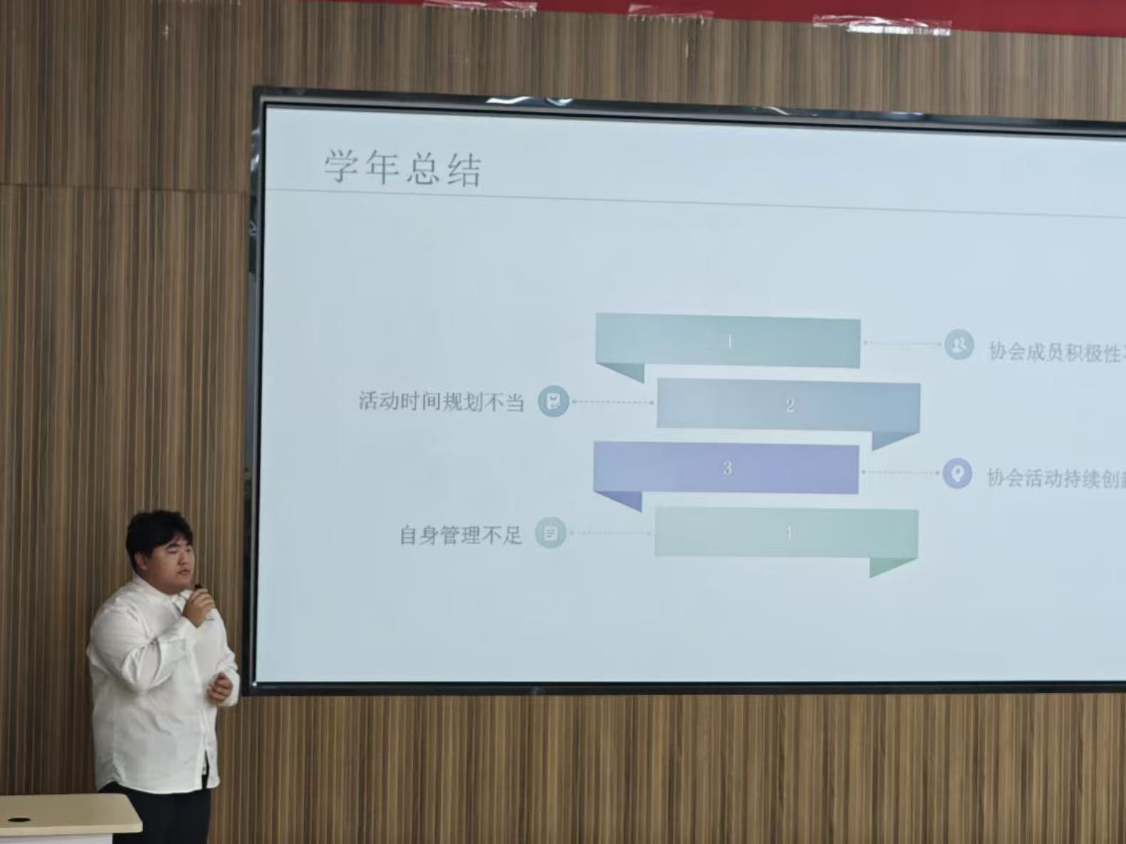 环检协会、模型协会、CAD协会、建筑技能促进协会、VR协会、文创协会的会长代表们依次登台述职。每位负责人均做了充分准备,通过详实的数据、生动的案例,系统回顾了本协会一学年以来组织开展的各类活动,深度分享了在工作实践中收获的成长感悟、取得的工作成果与宝贵经验。