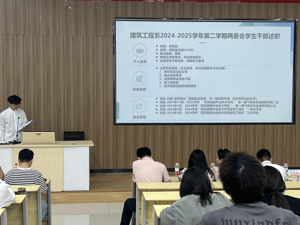 本网讯/为全面总结学生干部在本学年中的工作表现,深入总结工作经验,查找存在问题,明确改进方向,进一步提升学生干部的综合素质和履职能力,增强学生组织的凝聚力和执行力,为今后的学生工作夯实基础。建筑工程系于2025年6月19日在阶梯教室二成功开展了2023级两委会学生干部期末述职评议活动。本次述职评议由建筑工程系2023级两委会各部门学生干部进行现场述职,系党总支书记魏长专老师、系学生科科长兼团总支书记刘克芹老师及各部门分管老师共同评议,2024级储备干部及干事到现场观摩学习。
