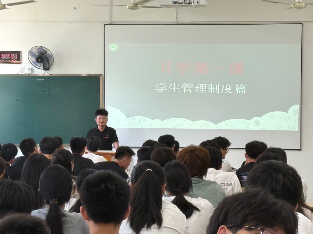 辅导员围绕《高等学校学生行为准则》及福建林业职业技术学院校内考勤、奖助贷、请假流程等管理制度,用通俗语言拆解条款,解答学生关于评优评先、课程学修等疑问,并通过学生手册领读、班级群分享制度文件,让学生清晰知晓行为规范与发展路径,为新学期学习生活做好规划。
