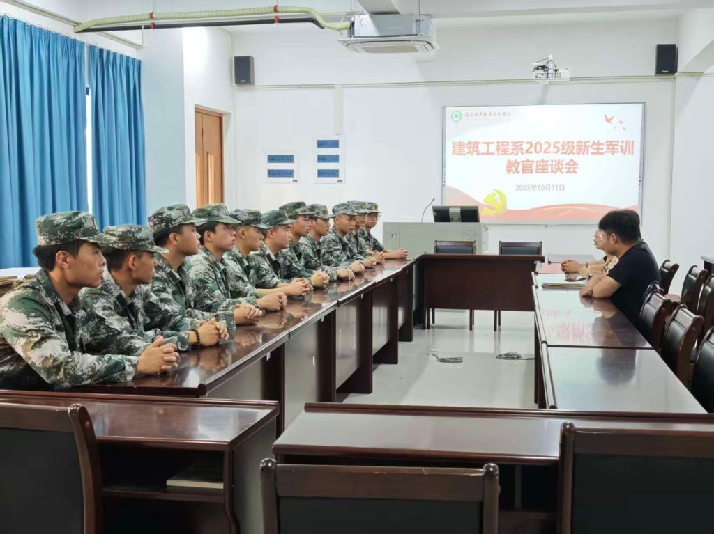 本网讯/10月11日,2025级新生军训教官座谈会在建工楼502举行。此次座谈会由建筑工程系党总支书记魏长专老师、学生科科长兼团总支书记刘克芹老师、2025级新生辅导员李楚楚老师、张道良老师和黄登峰老师以及2025级新生军训教官代表参加。