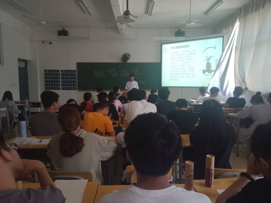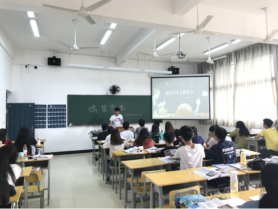 班会通过PPT图文知识讲解,小组讨论,代表陈述,辅导员总结发言等丰富形式展开,通过班会教育同学们懂得诚实守信是中华民族的传统美德,现代社会更需要诚实守信;反对虚假和不守信用的行为,反省自己不诚实不守信的行为,做一个诚信的小公民;增强自信,努力做到说话做事实实在在,表里如一;诚信考试,做文明考生。最后还组织全班同学签订了诚信承诺书。