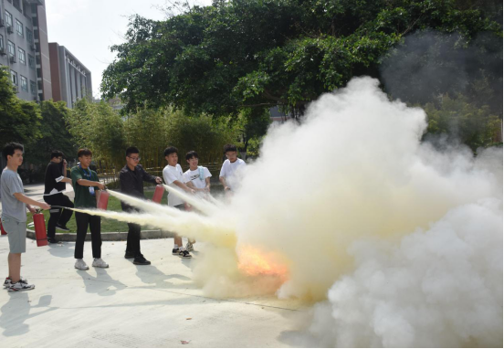 最后,由安保处处长胡宗焕老师讲解灭火器的使用方法、注意事项,并进行灭火器实操演练。在认真听讲及观摩后,老师和学生们亲自体验了现场灭火的过程,胡宗焕老师在现场对大家使用灭火器的动作进行规范指导。