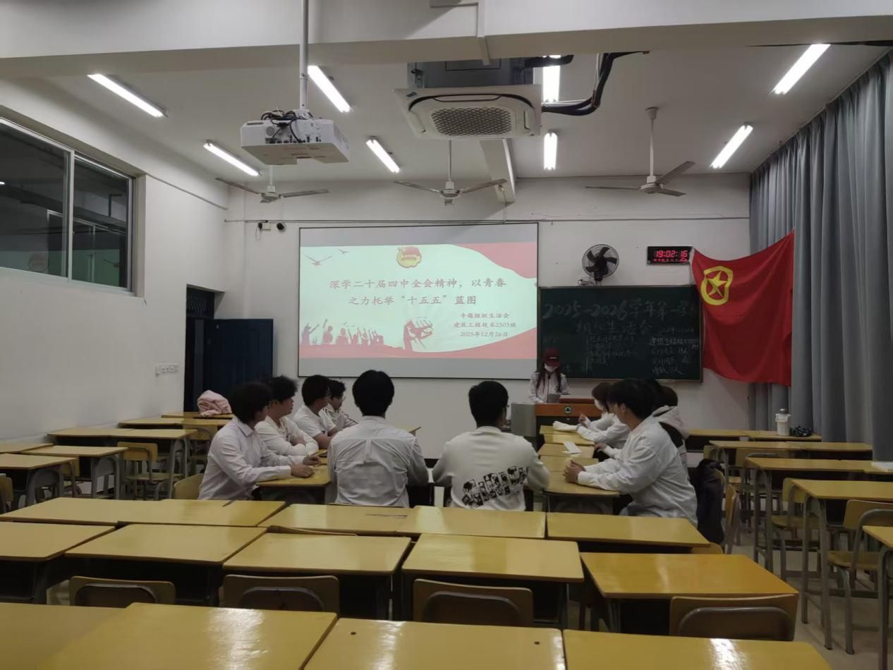 本网讯/为深入学习贯彻党的二十届四中全会精神,引导广大团员青年准确把握“十五五”规划对建筑领域青年人才培养的新要求,进一步强化责任意识和使命担当,2025年12月,建筑工程系各班级团支部陆续开展“深学党的二十届四中全会精神,以青春之力托举‘十五五’蓝图”专题组织生活会,通过团员互评、民主评议、先进选树等形式,推动全会精神与团员成长深度融合。