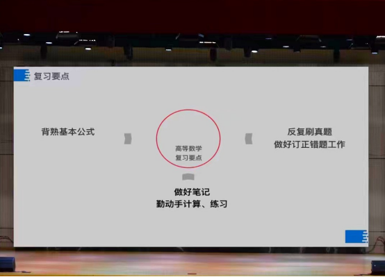 在高等数学这门科目上,谢睿凯同学提出了以下四点建议:首先,应把最基本的重要公式背熟(例如求导公式,不定积分公式等),并将高数课程完整地学习三遍以上。接着,学习好高数需勤动笔去加以练习、计算,应做到听练相结合。其次,也要将所学的知识联系起来,拓宽思维,这样更能从容应对难题与新题型。最后,可以通过对历年真题的复盘,清晰地找到薄弱的知识点,在后期复习中更有针对性地加以攻破。
