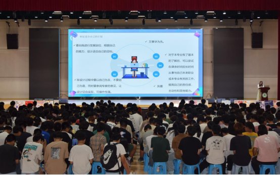 本网讯/为帮助2023级新生更好的适应大学生活,进一步提高职业生涯规划意识,建筑工程系于9月22日在江南体育馆召开大学生职业生涯规划专题讲座,本次讲座由建筑工程系新生辅导员丁雨涵老师主讲。